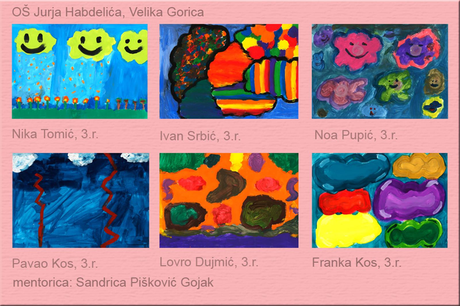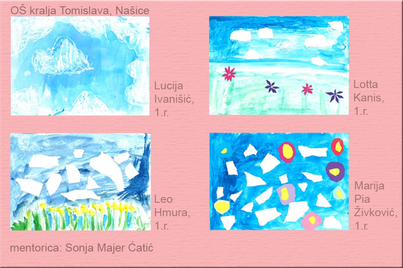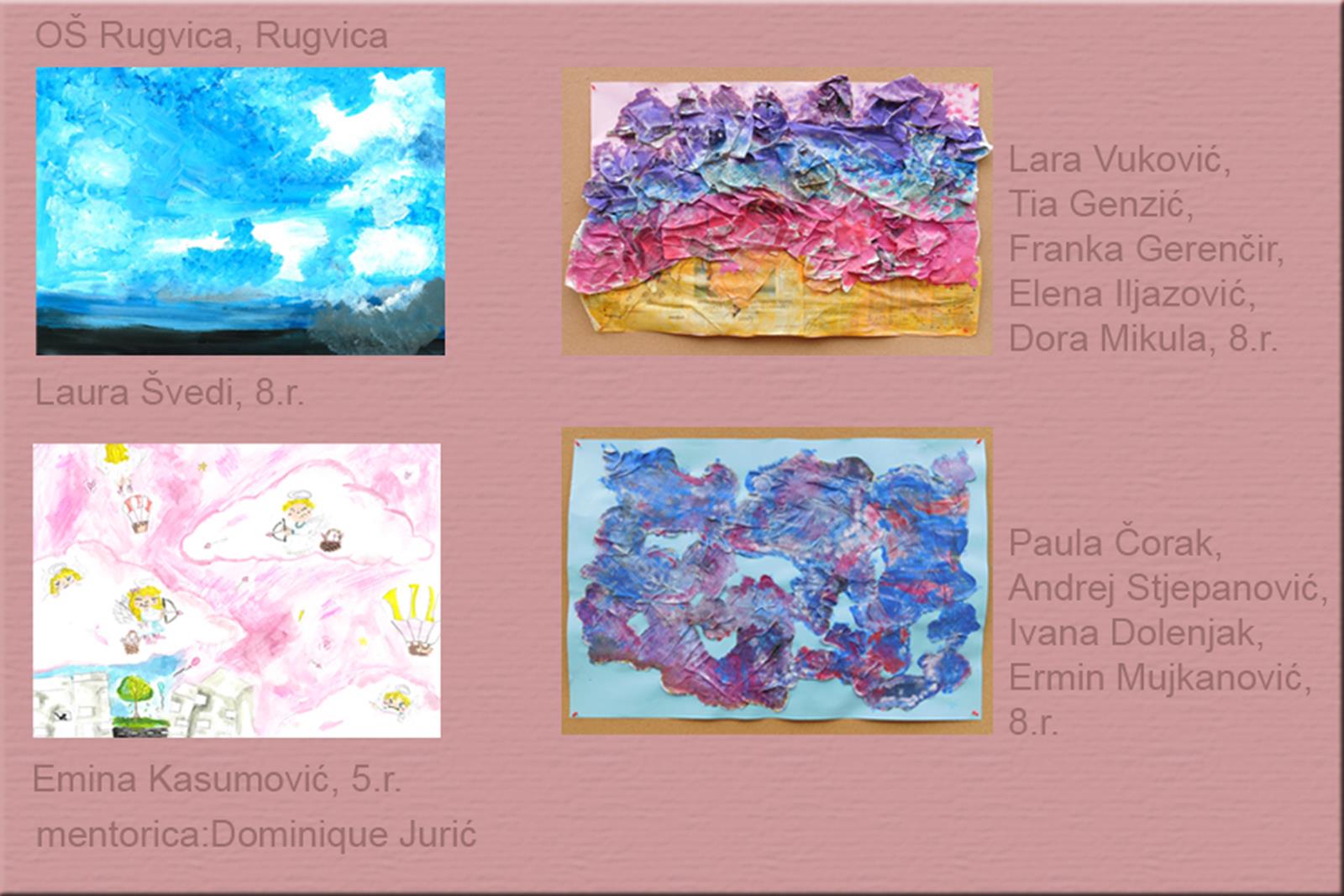 Djeca su svoje vizije pretočila u različite likovne tehnike – od kolaža, akvarela, tempere i grafike, do fotografije, batika, instalacija, skulptura i zajedničkih radova. U tom šarenom i raznolikom nizu pristupa otkrivamo kako svaki pogled prema oblacima postaje osobna interpretacija, igra i istraživanje.