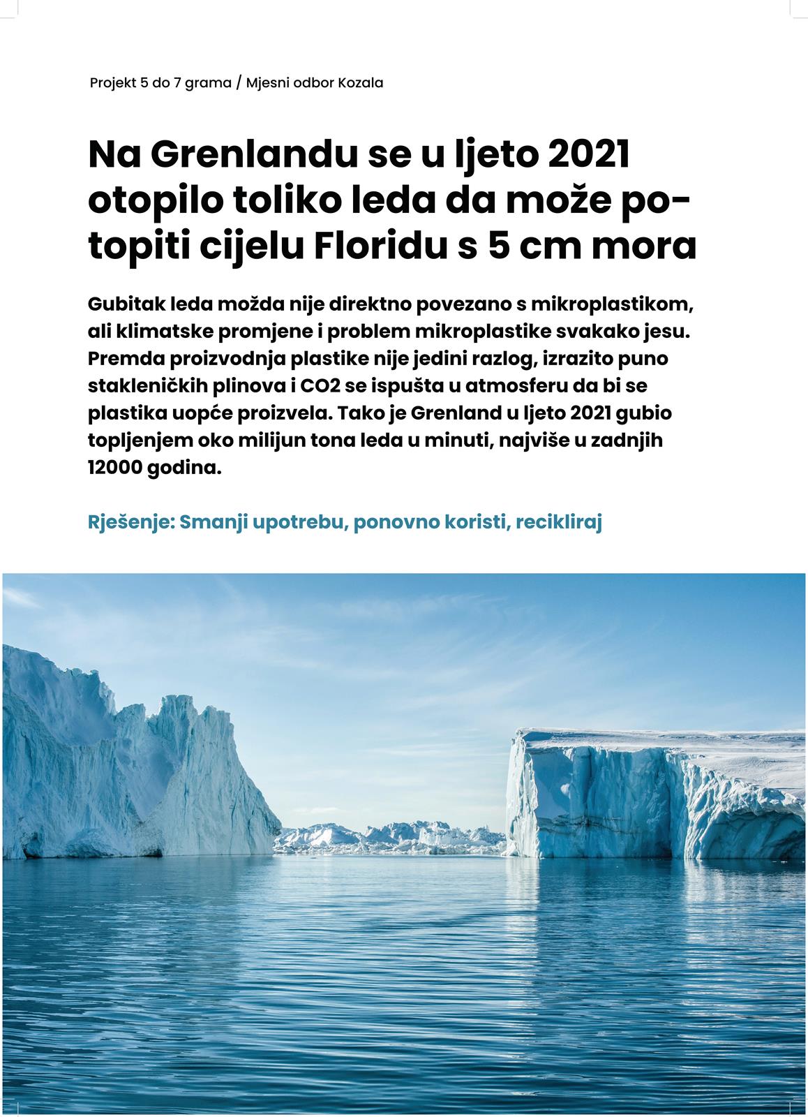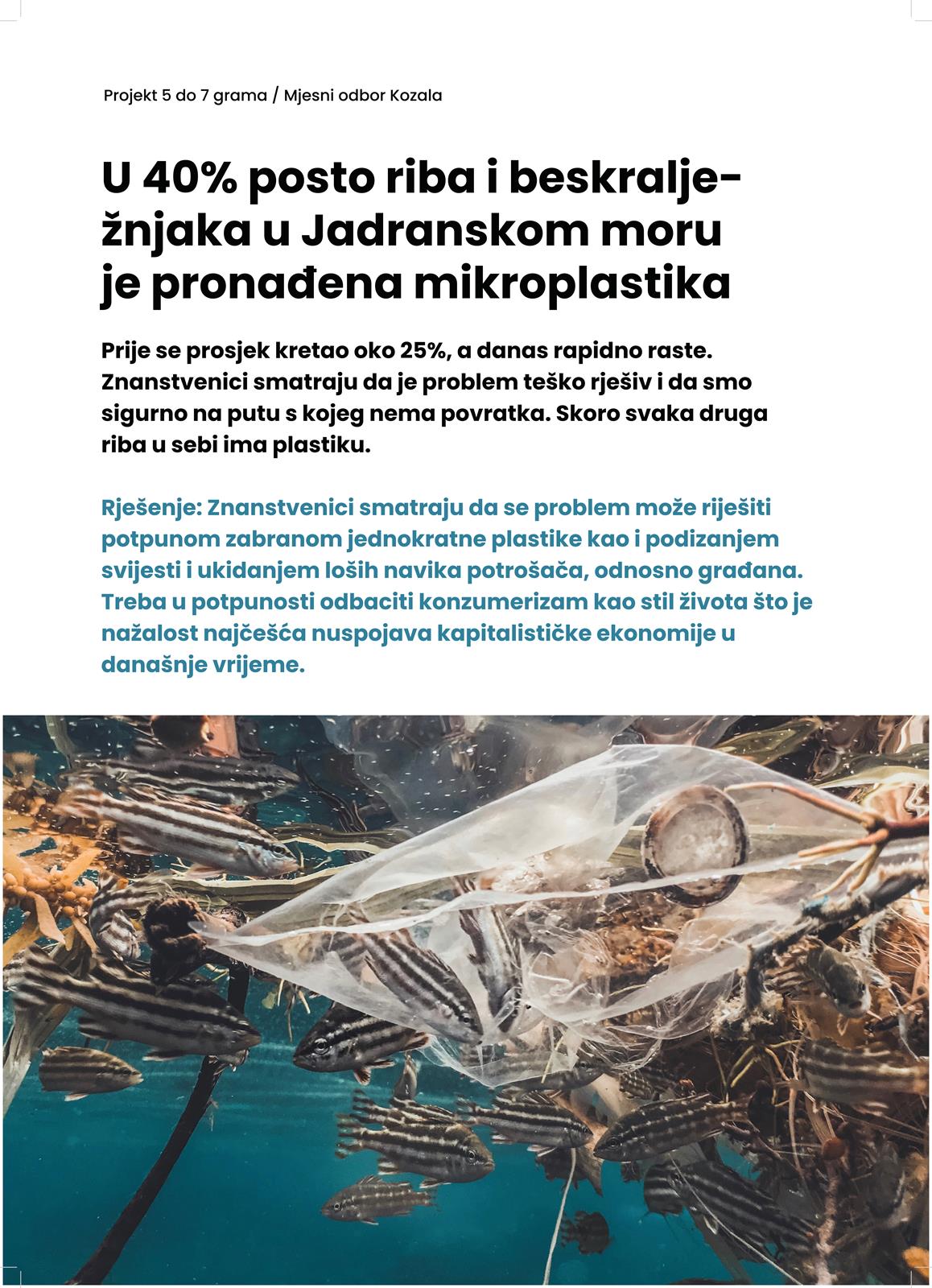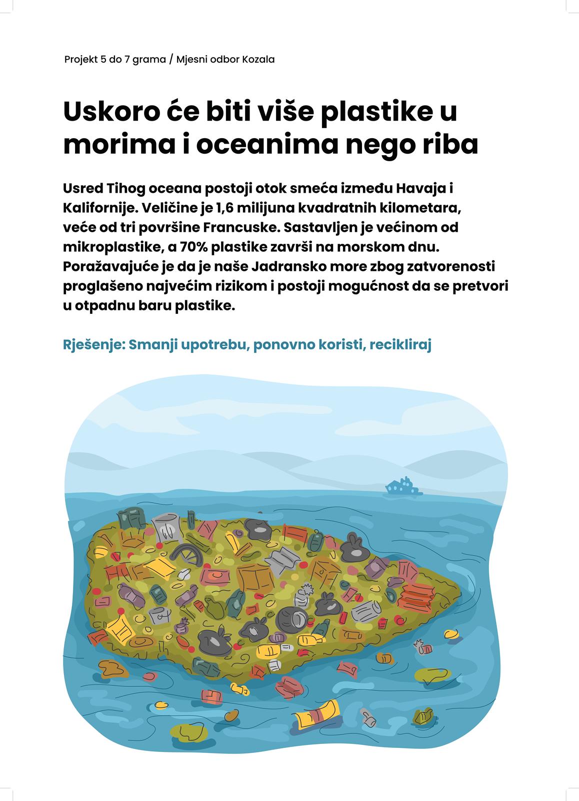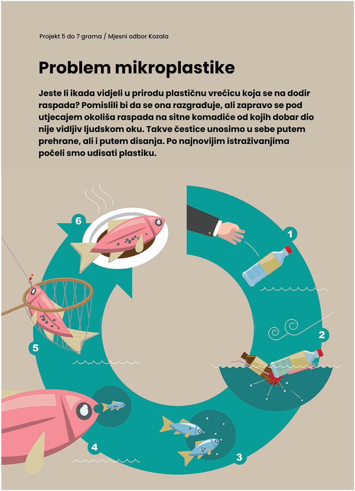 Izložba „5 do 7 grama“ autorice Ane Somek i Filipa Jakovca sastoji se od 19 plakata koji opisuju gorući problem danas u svijetu, a to je utjecaj mikroplastike na ljudski organizam, na ekosustave i na cijeli planet.