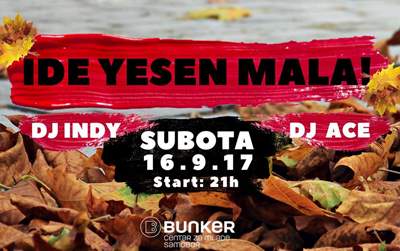 Ide yesen mala! / Subota 16.9. / Bunker Padaju temperature, pada lišće, padaju studenti… Ma neka pada, u Bunkeru si na sigurnom! 😃😎💪👊 U subotu 16.9. odajemo počast jeseni (po novom yesen), prizivamo kišu i čagamo do jutra… Ovoga pulta za pultom te čekaju DJ Indy i DJ ACE… Što još više reći? Lokaciju znaš, vrijeme znaš, samo se trebaš pojavit...