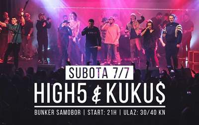 💥Što: HIGH5 & KUKU$ (Warmup: Tikach) 📣 🕒Kada: Subota 7.7. u 21:00h 📍Gdje: Bunker Samobor 😁 🎫Karte: 30kn u pretprodaji, 40kn na ulazu (Promotori uskoro!)