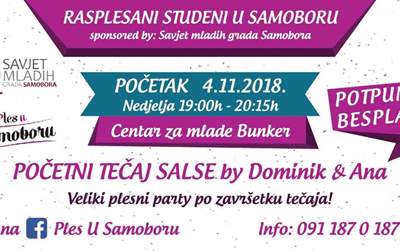 [BESPLATAN POČETNI TEČAJ SALSE] sponsored by Savjet mladih grada Samobora Prekrasna suradnja se nastavlja! NEDJELJA, 4.11.2018. BUNKER, 19h, krećemo s početnim tečajem salse. Dođite bez ikakvih obaveza i maksimalno uživajte uz naše trenere Dominika i Anu. Prijave u INBOX ili na 091 187 0 187- Marko. PuS