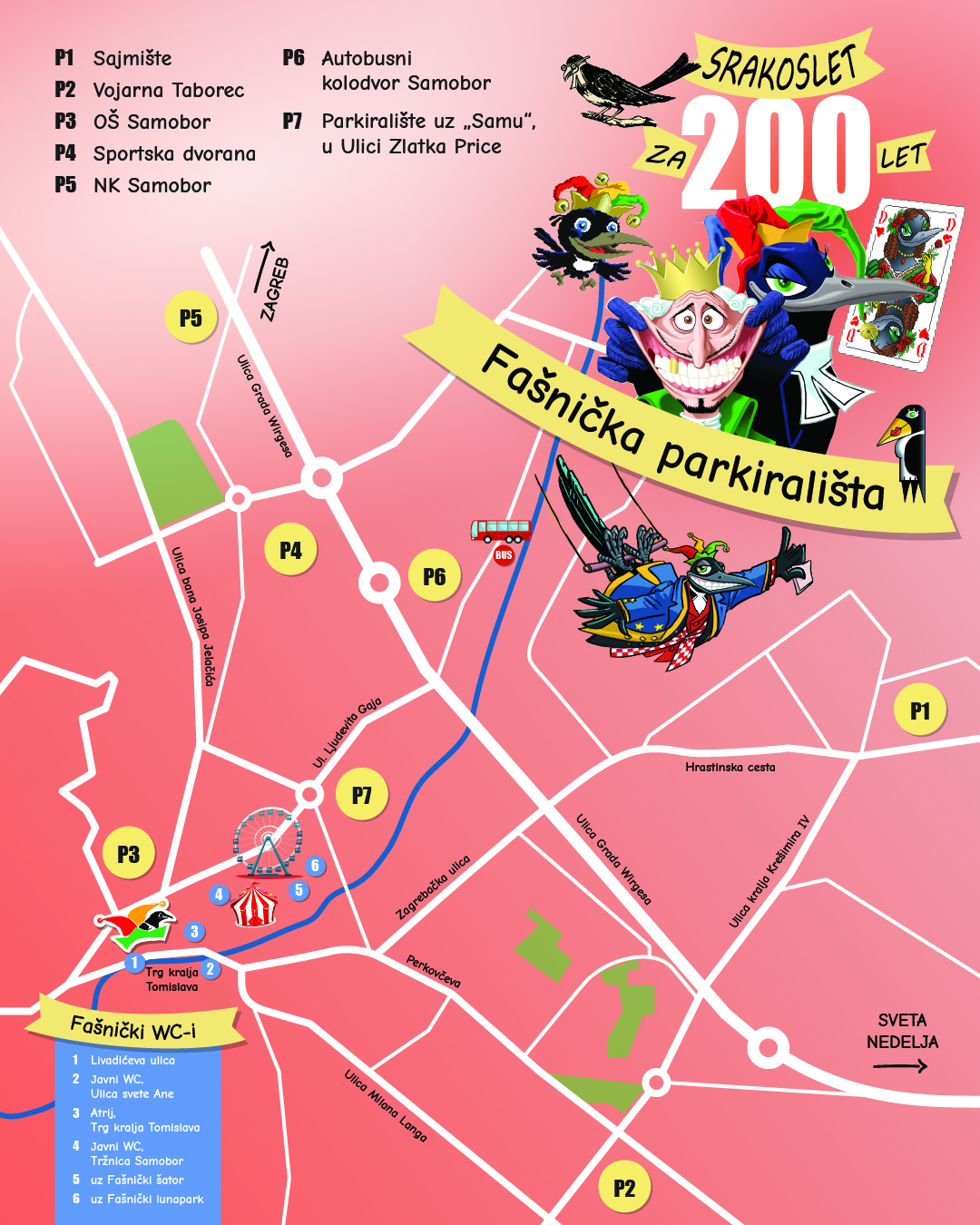 U vrijeme održavanja programa obje fašničke subote privremena prometna regulacija bit će na snazi od 10:00 do 23:00 sata s time da će prve subote, 7. veljače u tom periodu biti zatvoreni Trg kralja Tomislava, Livadićeva ulica, Perkovčeva od raskrižja s Langovom do glavnog gradskog trga, Ulica svete Ane od Trga kralja Tomislava do Ulice Franza Liszta, Jurjevska te Šmidhenova od Trga kralja Tomislava do Obrtničke ulice. Od 10:00 do 13:00 sati bit će zatvorene Perkovčeva od Trga do raskrižja sa Zagrebačkom i Ivanščakovom, Mlinska od Perkovčeve do Ivanščakove, Zagrebačka od Žumberačke do Perkovčeve, Ivanščakova od Perkovčeve do Kompareove, Perkovčeva od raskrižja s Ulicom Grič do Ivanščakove i Kompareova od Gajeve do Ferka Ivanščaka. Od 10 do 18 sati bit će zatvorena Langova od Perkovčeve do Ulice Giznik, a od 10 do 11 sati Perkovčeva od Mirnovečke do Zagrebačke, Svetonedeljska od Mirnovečke do Perkovčeve, Dalmatinska od Perkovčeve do Žumberačke, Ulica Josipa Vanjeka od Perkovčeve do Ulice Bogumila Tonija, Adžijina od Žumberačke do Perkovčeve te Ulica Grigora Viteza od Ulice B. Tonija do Ulice J. Vanjeka. Zatvoren će biti i promet Kleščićevom i Milakovićevom od 10 sati do ponoći.