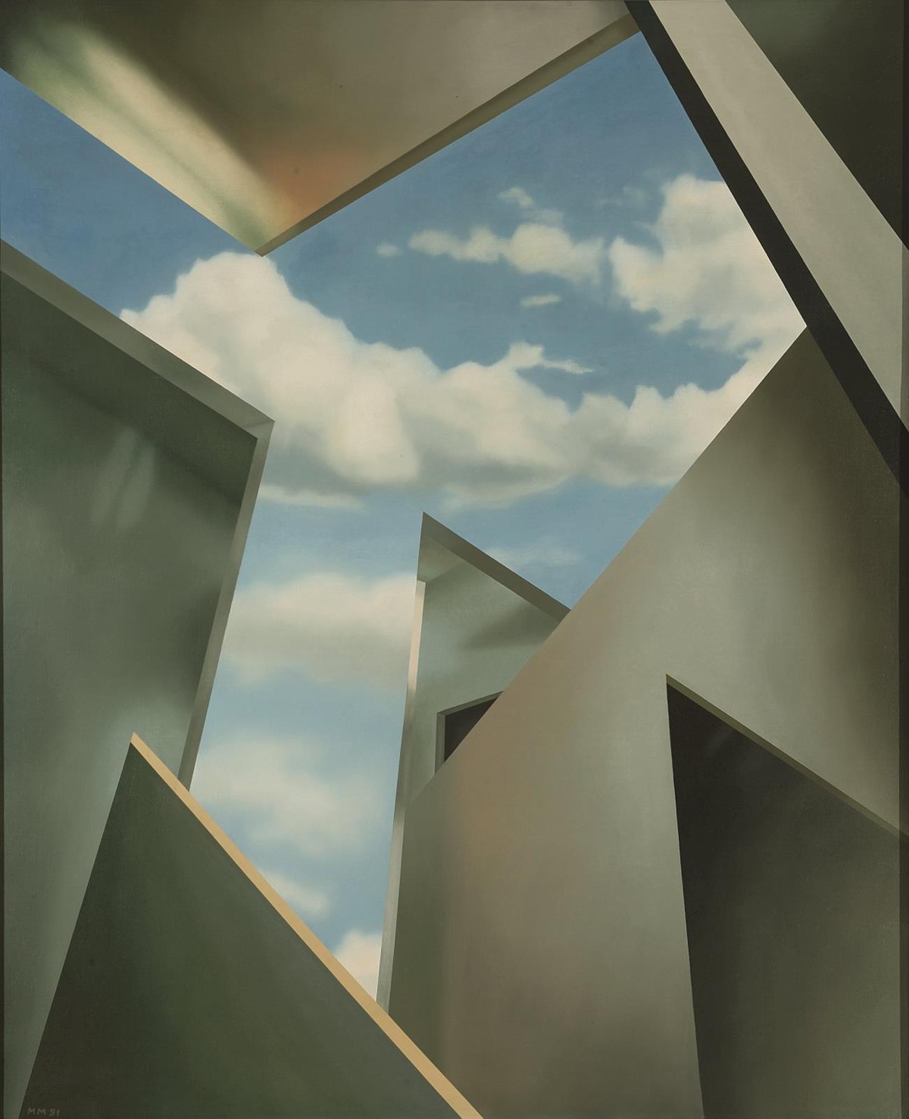 Moderno društvo s razvojem industrije i prometa te posebno vojne industrije dovelo je i do onečišćenja u formi oblaka koji nisu prirodnog porijekla. Bujanje gradova, megalopolisa alijenira čovjeka od prirode, pa nije rijetko da se nebo tek krajičkom nazire između visokih nebodera. Jedan takav primjer je slika Marijane Muljević koja, za razliku od lepršavog suživota djevojaka i oblaka na slici Tomislava Buntaka, oštrim plohama, a što sugerira i naslov slike, Oštrice, 1991., kadrira izrez kroz koji proviruje komadić nježno plavo-bijelih oblaka. Izrez je to otuđene gradske vizure prema oblacima na nebu, prema djeliću prirode. Dihotomiju slike provocira nelagoda izazvana takvim strogim, hladnim plohama suvremene hladne arhitekture s jedne strane i izrezak vedrog neba s nježnim svijetlo plavičastim oblacima s druge strane.