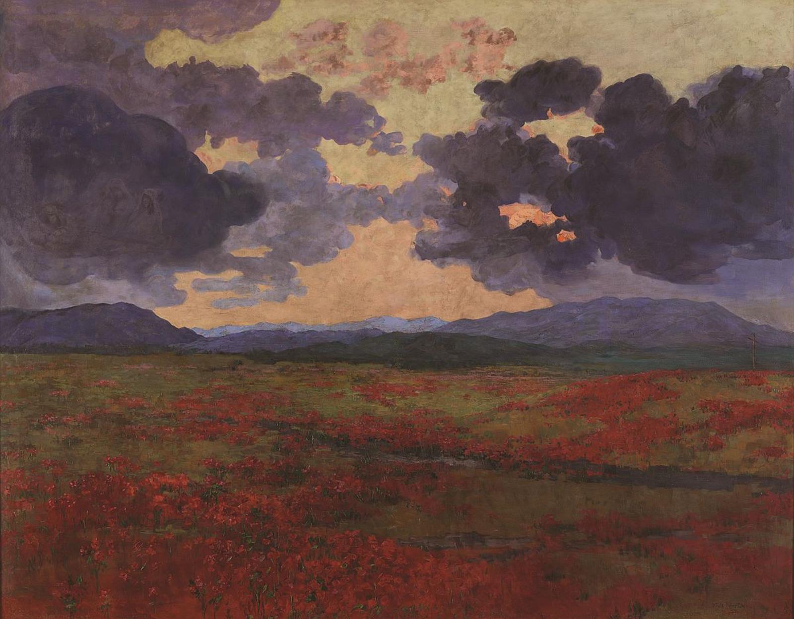 Slika Otona Ivekovića iz 1923. godine nosi idiličan naziv Pejzaž s makovima, i doista, na prvi pogled bit ćemo oduševljeni impresionistički naslikanim poljem crvenih cvjetova koji se prostiru u dubinu slike. No, ako se bolje zagledamo, primjećujemo da nas slikar vodi dalje u drugi plan, u gornju polovicu slike na kojoj vidimo velike zgusnute mase oblaka koje se gomilaju na narančastom nebu. No, tek kad se još bolje zagledamo, primjećujemo da oblaci nisu samo oblaci, već da je slikar u njih smjestio likove mrtvih vojnika i žena koje nariču nad njima. U tom trenutku postajemo svjesni da se radi o ratnoj slici i da su makovi zapravo vojno stratište natopljeno krvlju brojnih žrtava. Iveković je kao ratni slikar u nekoliko navrata sudjelovao u Prvom svjetskom ratu na različitim bojištima od Soče do Galicije i svjedočio je strahotama rata koje su na njega ostavile posljedice i u privatnom i u profesionalnom životu. No, kao umjetnik odgojen u duhu romantizma i historicizma nije bio sklon eksplicitnom prikazivanju ratnih stradanja, već je o toj bolnoj temi govorio na indirektan način. Služeći se metodom inverzije, glavnu radnju smjestio je u prostor irealnog, u „oblake koji to zapravo nisu“. A to je upravo sama bit oblaka – „iako su prolazni, vječni su, naša prolaznost završava smrću, a njihova metamorfozom.“[25]