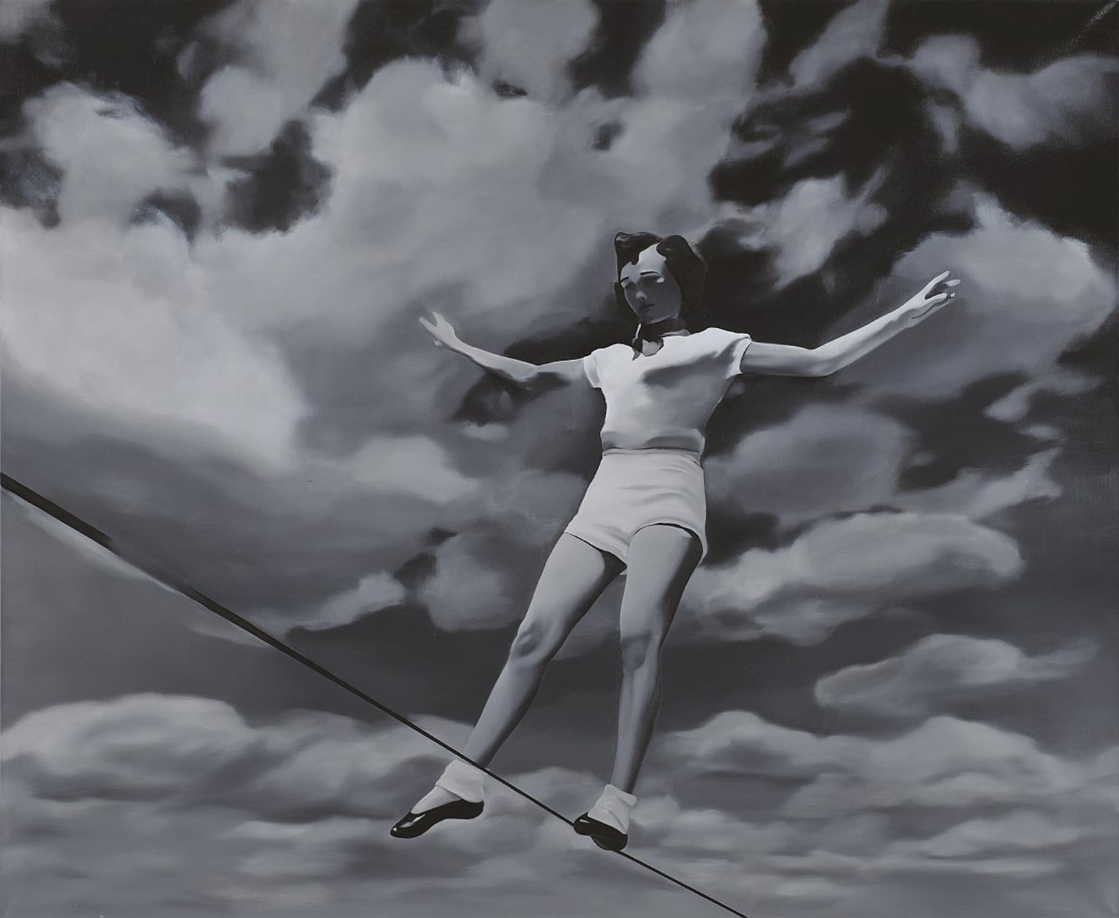 Na sličnom je tragu i Martina Grlić – njezin ženski lik ekvilibrira između plavičastih oblaka koji kao da joj pružaju mekani oslonac u njenom opasnom činu. Slikarica u svom radu koristi stare fotografije te ih dekontekstualizira i lišava njihovih izvornih značenja. Na taj način nastao je i rad u kojem prikazuje ženski lik koji „hoda po oblacima“, On wire, 2010. Izvorna fotografija nekad je bila dokument jednog socijalističkog sleta, a danas je suvremena alegorija umjetnosti.