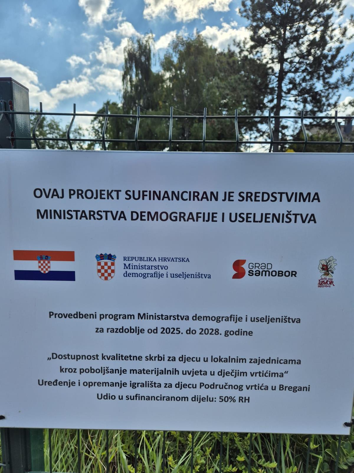 Završen je projekt uređenja dječjeg igrališta u područnom vrtiću Dječjeg vrtića Izvor u Bregani. Dotrajala igrala zamijenjena su novima. Postavljeno je ukupno sedam novih igrala: ljuljačka s košarom, pješčanik s poklopcem, kombinirana sprava s toboganom i kućicom, vrtuljak, tunel, klackalica na oprugama i njihalicia. Zbog sigurnosti djece uz sva igrala postavljene su antistres gumene podloge čime su osigurani bolji i sigurniji uvjeti za svakodnevnu igru i boravak djece na otvorenom. Projekt je sufinanciralo Ministarstvo demografije i useljeništva u iznosu od 12.681,25 eura. Zahvaljujući ovom projektu, dvorište vrtića u Bregani postalo je još veselije, sigurnije i ljepše mjesto za igru i druženje naših najmlađih!
