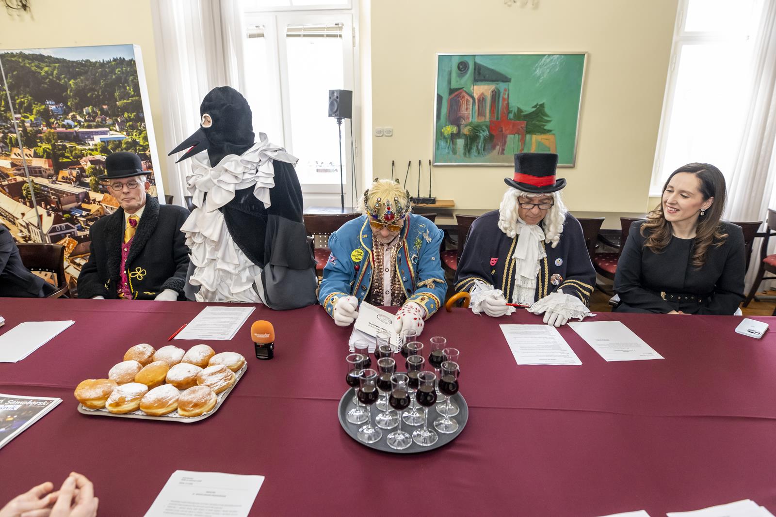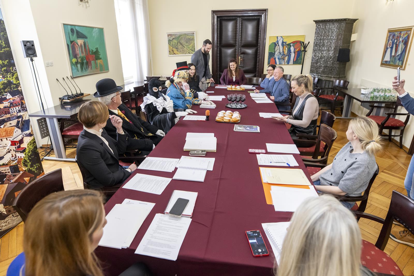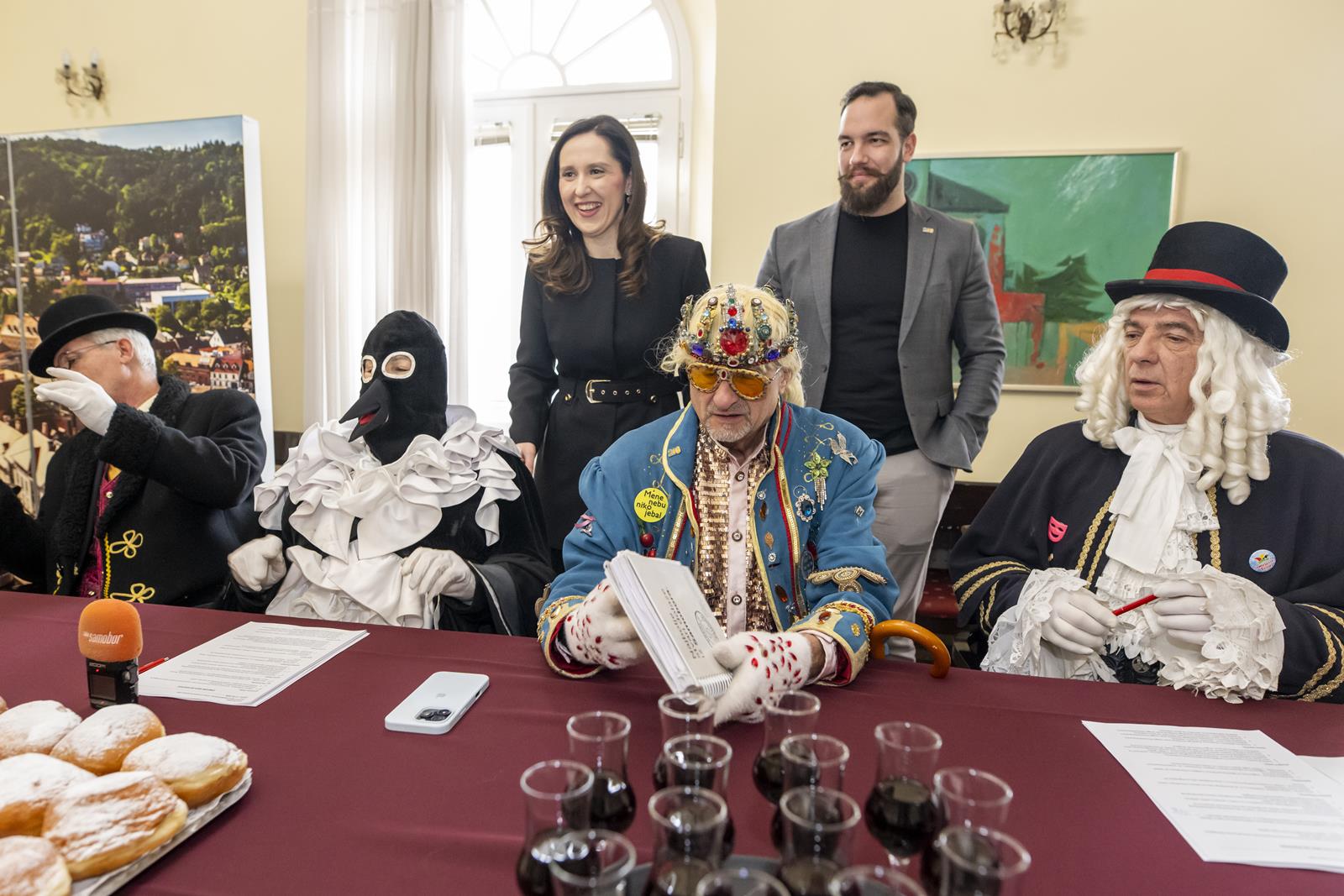 Zajednički kolegij Fašničke vlade s privremeno bivšim čelnicima i pročelnicima Grada održan je danas u gradskoj vijećnici. Princ Fašnik, Princeza Sraka, Fiškal i Sudac detaljno su „proučili” dnevni red te zaključili da nisu došli delati, već popiti bermet, pojesti krafne i čuti što muči gradske pročelnike.