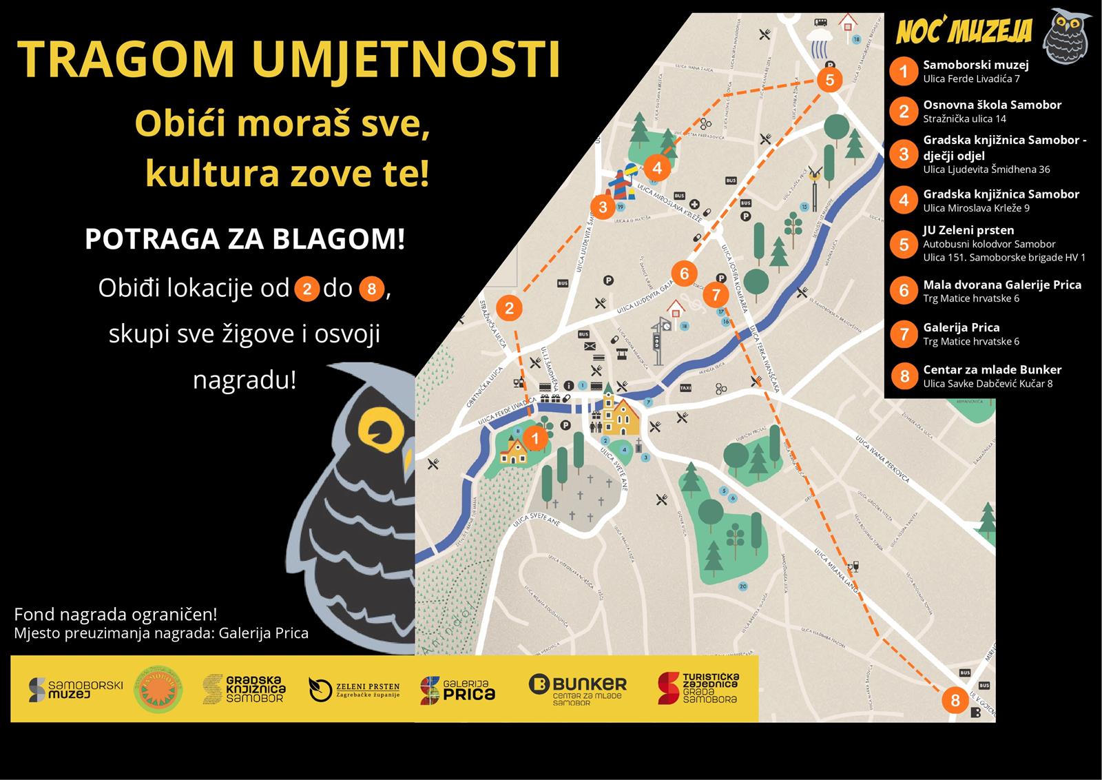 „Tragom umjetnosti - potraga za blagom“ poziva sve – djecu, mlade, obitelji i odrasle – da se uključe, istražuju, uče i uživaju u kulturi na drugačiji način. Projekt spaja kretanje, znanje, umjetnost i igru te Samobor pretvara u otvorenu kulturnu mapu.
