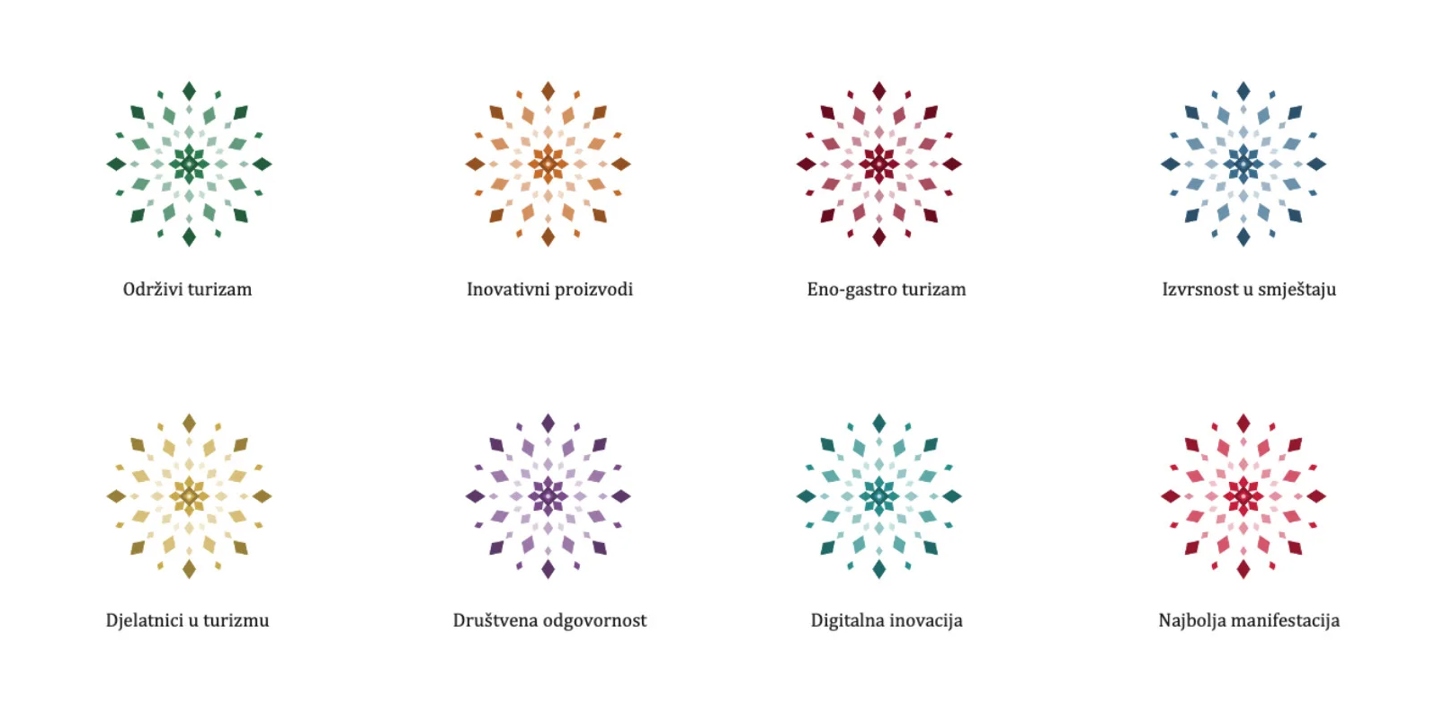 Nagrađuju se i iznimni djelatnici u turizmu i povezanim djelatnostima čiji profesionalizam, gostoljubivost i predanost radu značajno podižu kvalitetu turističke usluge i pozitivno utječu na doživljaj gostiju. Kategorija društveno odgovornog poduzetništva usmjerena je na poduzetnike i tvrtke koje kroz svoje poslovanje promiču odgovorno poslovanje, brigu o okolišu, lokalnoj zajednici i zaposlenicima. Digitalna inovacija u turizmu prepoznaje najbolje digitalne projekte, alate i kampanje koji doprinose promociji i razvoju turizma, dok kategorija najbolje manifestacije/eventa nagrađuje turističke manifestacije, festivale, sajmove i događanja koja privlače posjetitelje i obogaćuju kulturno-turističku ponudu županije.